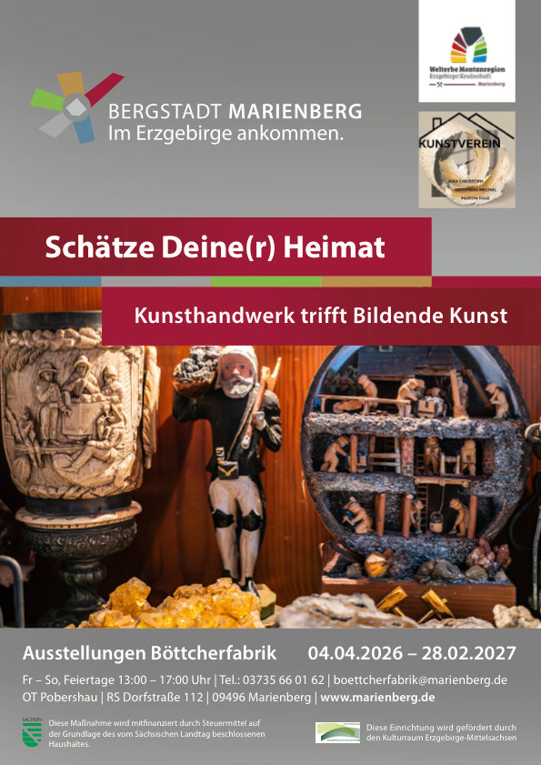 „Schätze Deine(r) Heimat“ Kunsthandwerk, trifft Bildende Kunst, so der Titel der neuen Ausstellung in der Böttcherfabrik Pobershau. Die Ausstellung zeigt die tiefe Verbundenheit erzgebirgische Künstler mit ihrer Heimat.