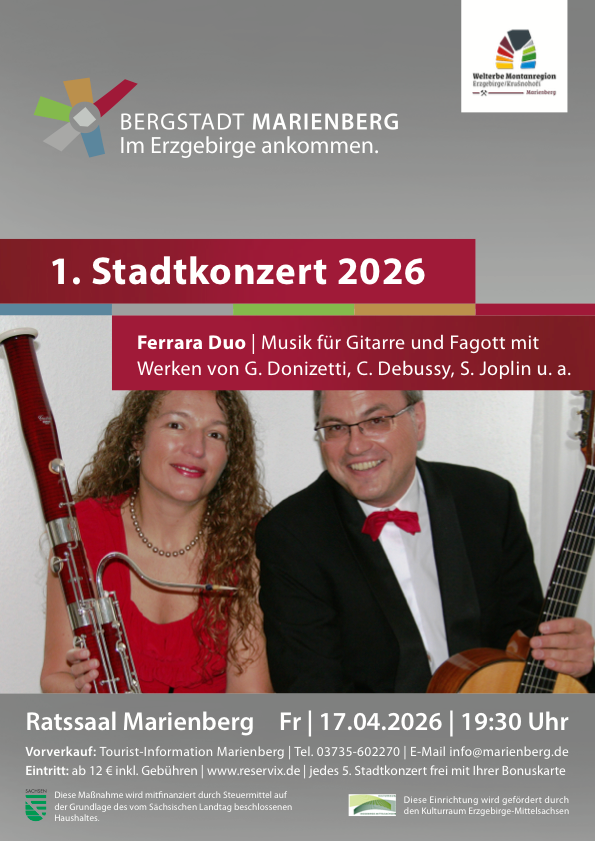 Im April steht auch das erste Stadtkonzert im Jahr 2026 auf dem Plan. Am Freitag, dem 17. April musiziert das Ferrara Duo im Ratssaal des Marienberger Rathauses.